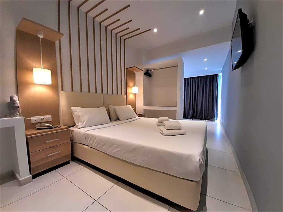 Payment is credit-card only, with Mastercard, Visa, and Maestro accepted; cash is not accepted. Parking is available for an extra charge. Rooms emphasize comfort with non-smoking options, free toiletries, a bathtub, balcony, and soundproofing, complemented by essential features like air conditioning and private terraces for evening Rhodes views.